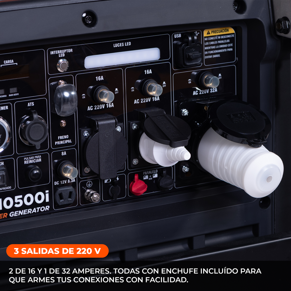 ALTA POTENCIA DE SALIDA: Con una potencia máxima de 10,500 watts y una potencia nominal de 8,500 watts, este generador cubre sobradamente las necesidades energéticas de maquinaria, herramientas eléctricas y dispositivos electrónicos sensibles.