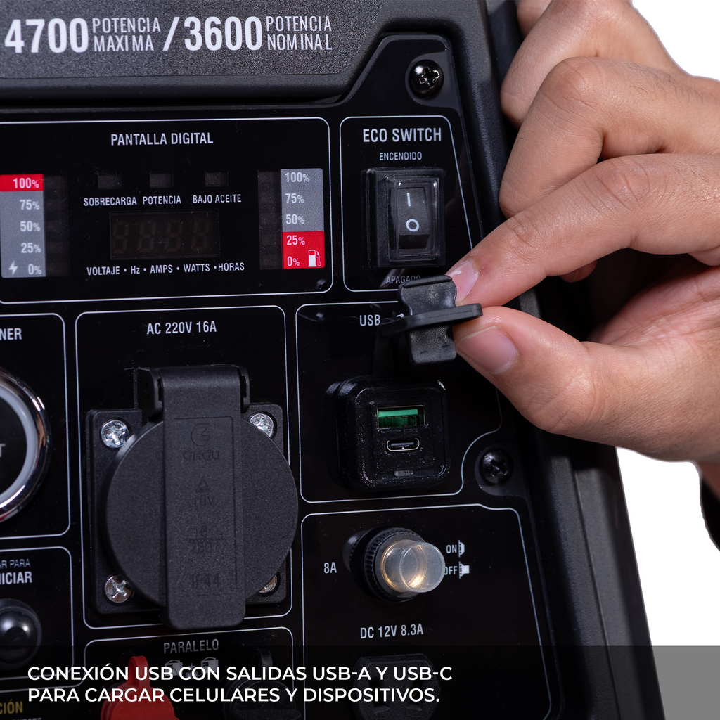 HASTA 15 HORAS DE FUNCIONAMIENTO: Su motor de 165cc y tanque de 3.6 litros le permiten operar de forma continua durante 6 horas a media carga, ideal para jornadas prolongadas sin interrupciones.